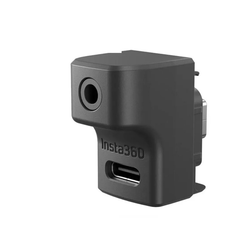 Incarca ACE sau ACE PRO in timp ce inregistrezi audio imbunatatit cu microfonul ales folosind adaptorul de microfon de la Insta360. Adaptorul se conecteaza la camera printr-un conector USB-C masculin si ramane fix datorita monturii integrate cu catarama. Un port audio de 3.5 mm permite conectarea unui microfon la camera. In acelasi timp, poti incarca camera prin portul USB-C feminin.